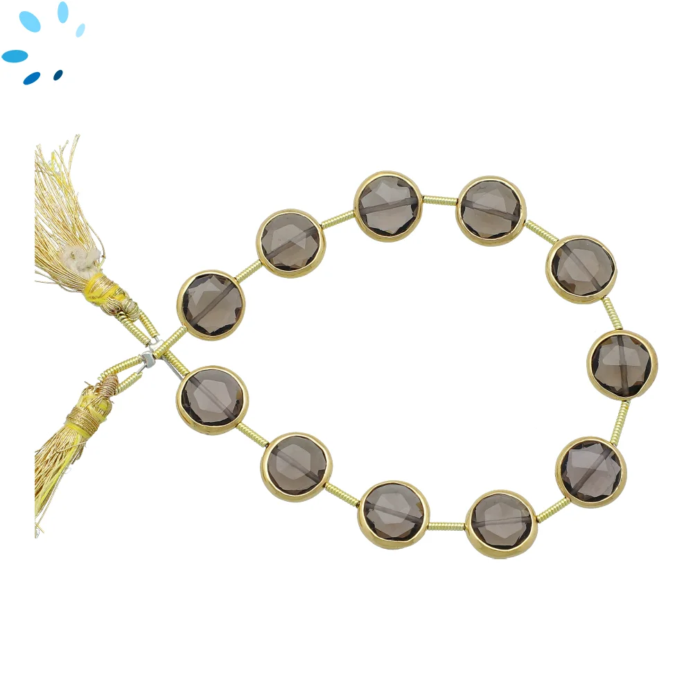 Smoky Quartz Faceted Coin Bezel Set Beads 10mm Center Drilled - 18k Gold Plated Sterling Silver