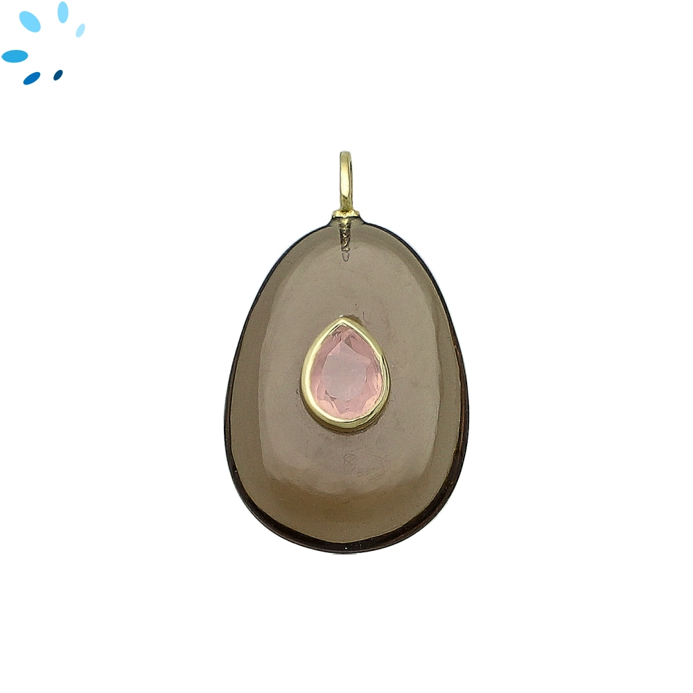 Smoky Quartz & Rose Quartz Pear Inlay Charm Pendant 27x20mm - 18k Gold Plated Sterling Silver