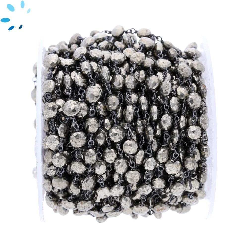 Pyrite Faceted Coin 5.0 - 6.0mm Sterling Silver Black Rhodium Plated Rosary Style Beaded Chain Per Foot