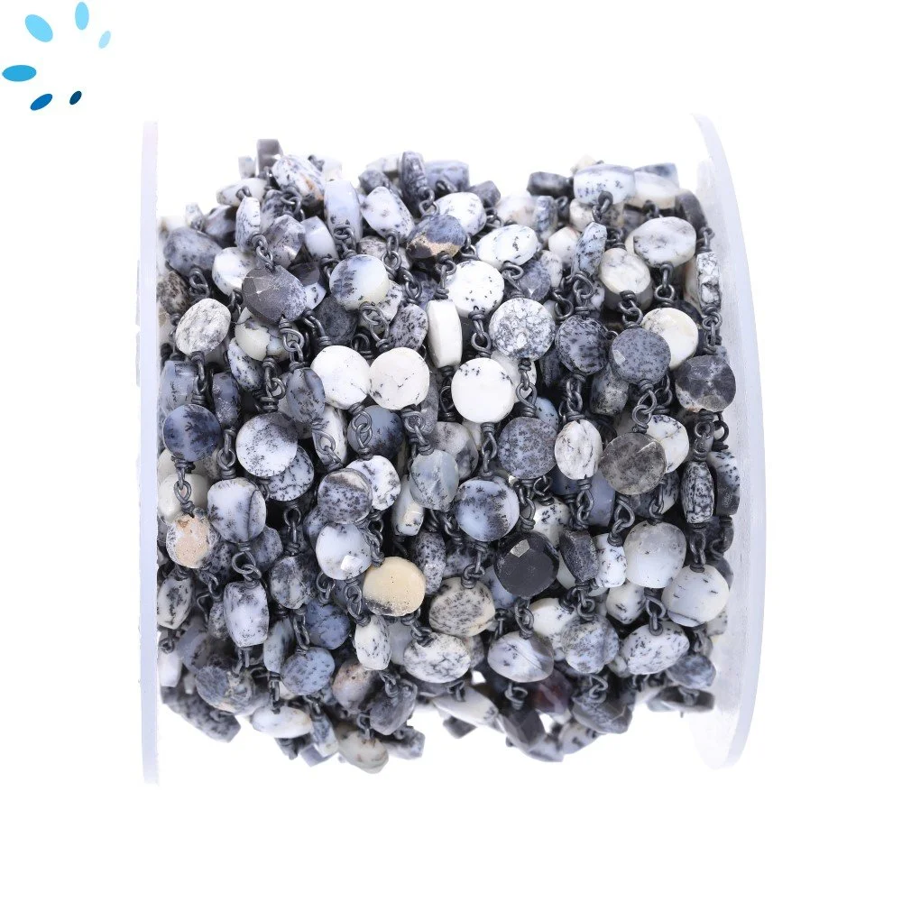 Dendrite Opal Faceted Coin 6.0-6.5mm Sterling Silver Black Rhodium Plated Rosary Style Beaded Chain Per Foot