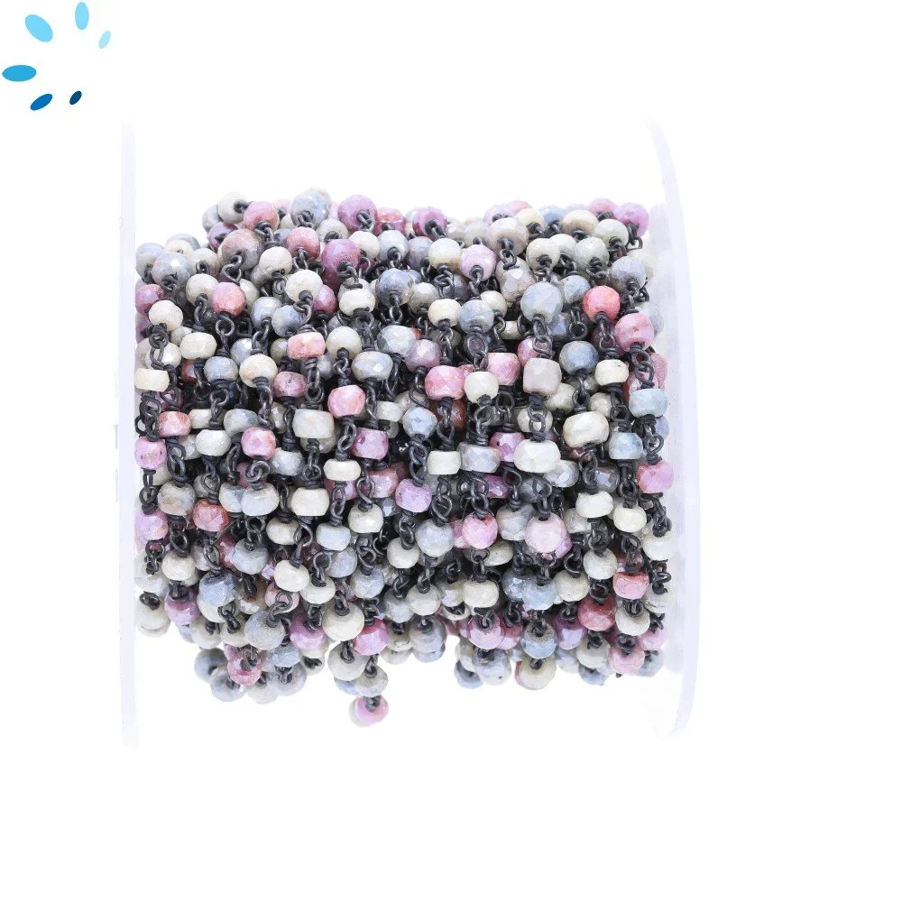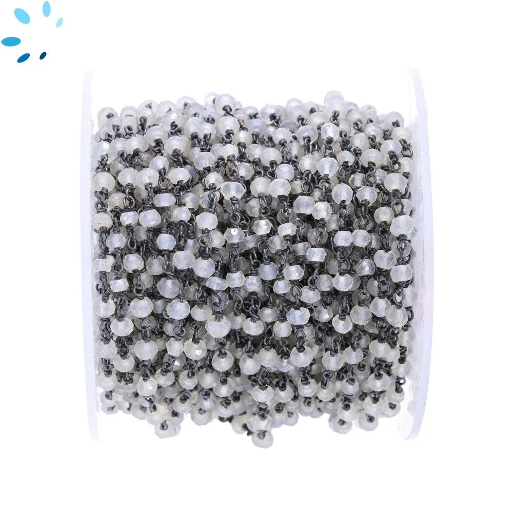 Rainbow Moonstone Faceted Button 3.5 - 4.0mm Sterling Silver Black Rhodium Plated Rosary Style Beaded Chain Per Foot