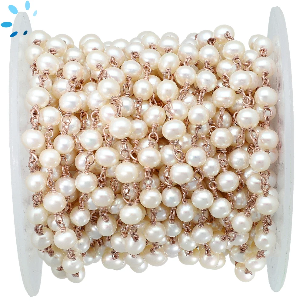 4.5 - 5.0mm Fresh Water Pearl Sterling Silver Rose Gold Plated Rosary Style Beaded Chain Per Foot