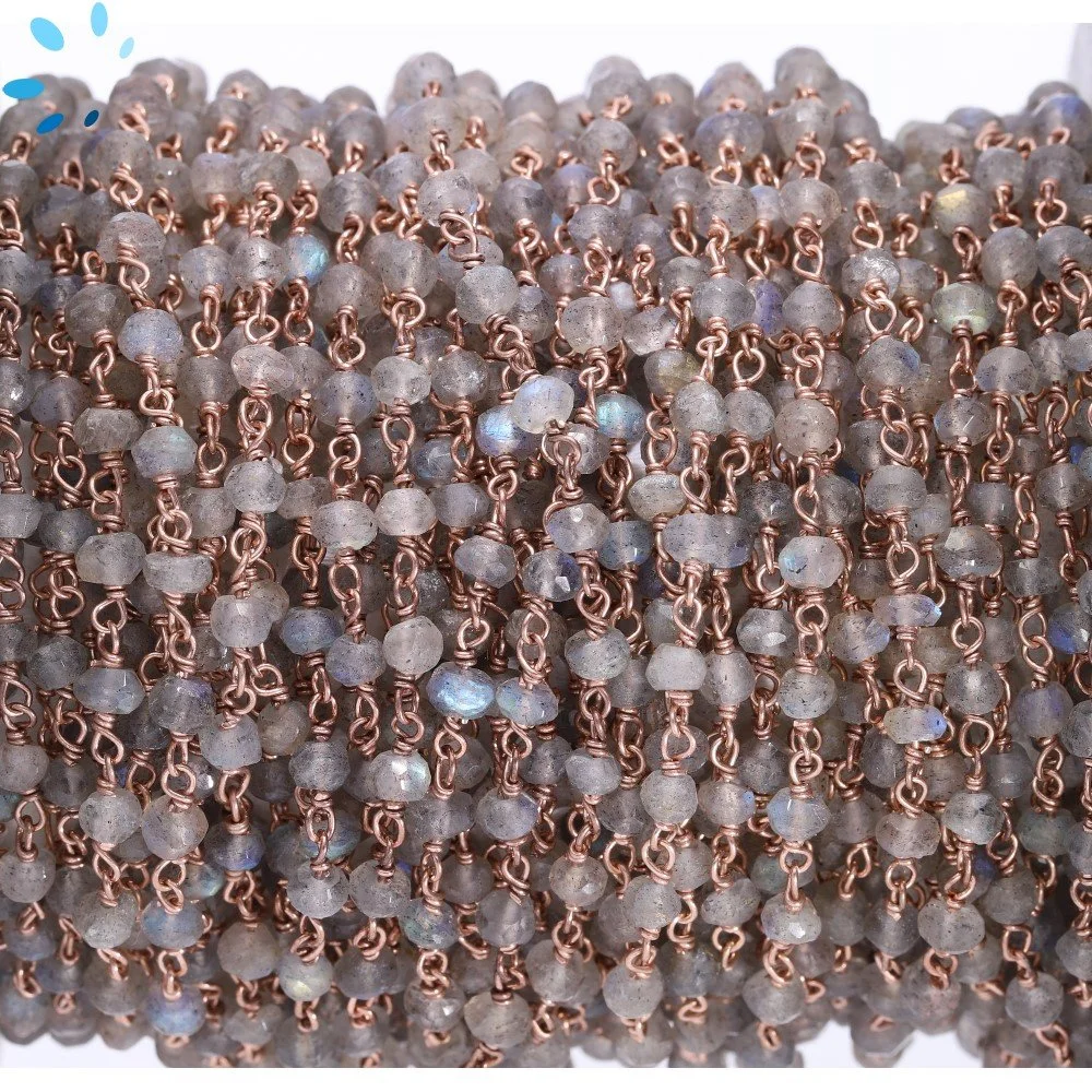 Labradorite Faceted Button 3.0 - 4.0mm Sterling Silver Rosary Style Beaded Chain Per Foot-Rose Gold Plated