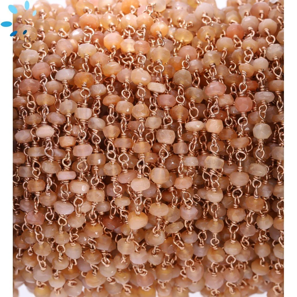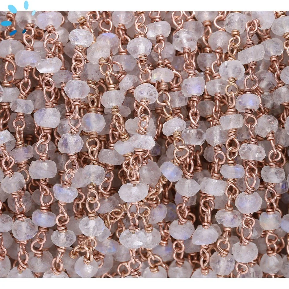 Rainbow Moonstone Faceted Button 3.5 - 4.5mm Sterling Silver Rose Gold Plated Rosary Style Beaded Chain Per Foot
