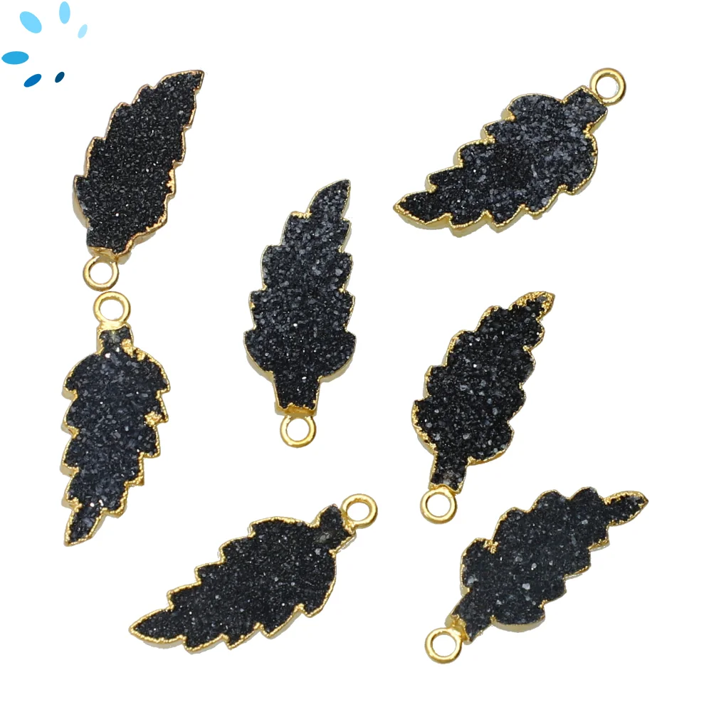 7. Black Druzy Leaf Charm Pendant 21x12 - 24x13mm 18k Gold Electroplated - Set of 4