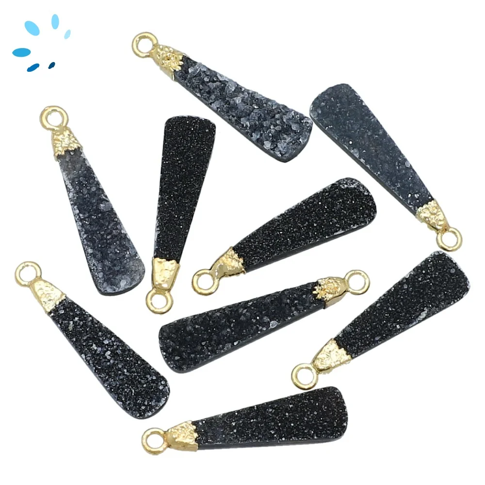 Black Druzy Long Drop Pendant Charm 23x7 - 25x8mm 18k Gold Electroplated - Set of 2