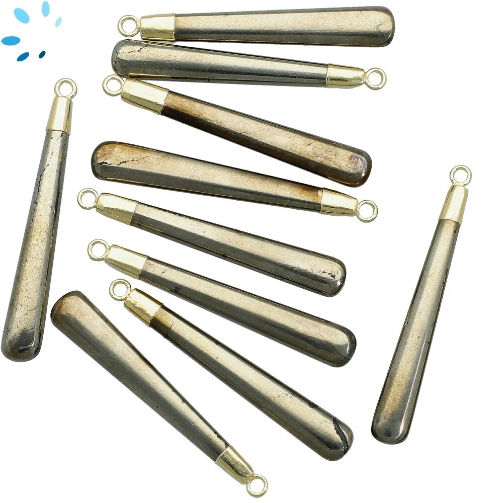 Pyrite Long Drop Bezel Pendant Charm 39x6 - 41x6mm - 18k Gold Plated Sterling Silver - Set of 2