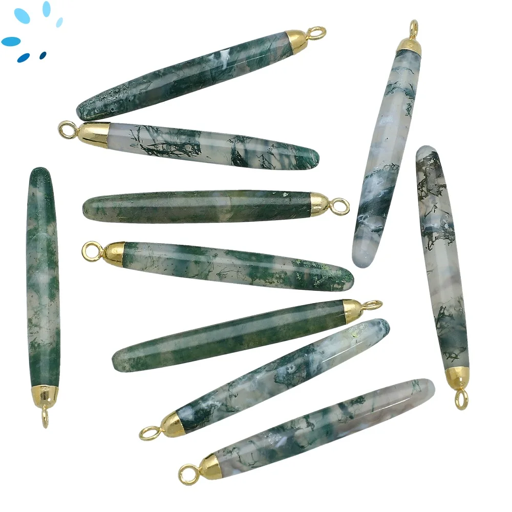 Moss Agate Long Drop Charm Pendant 39x6 - 41x6mm 18k Gold Electroplated - Set of 2