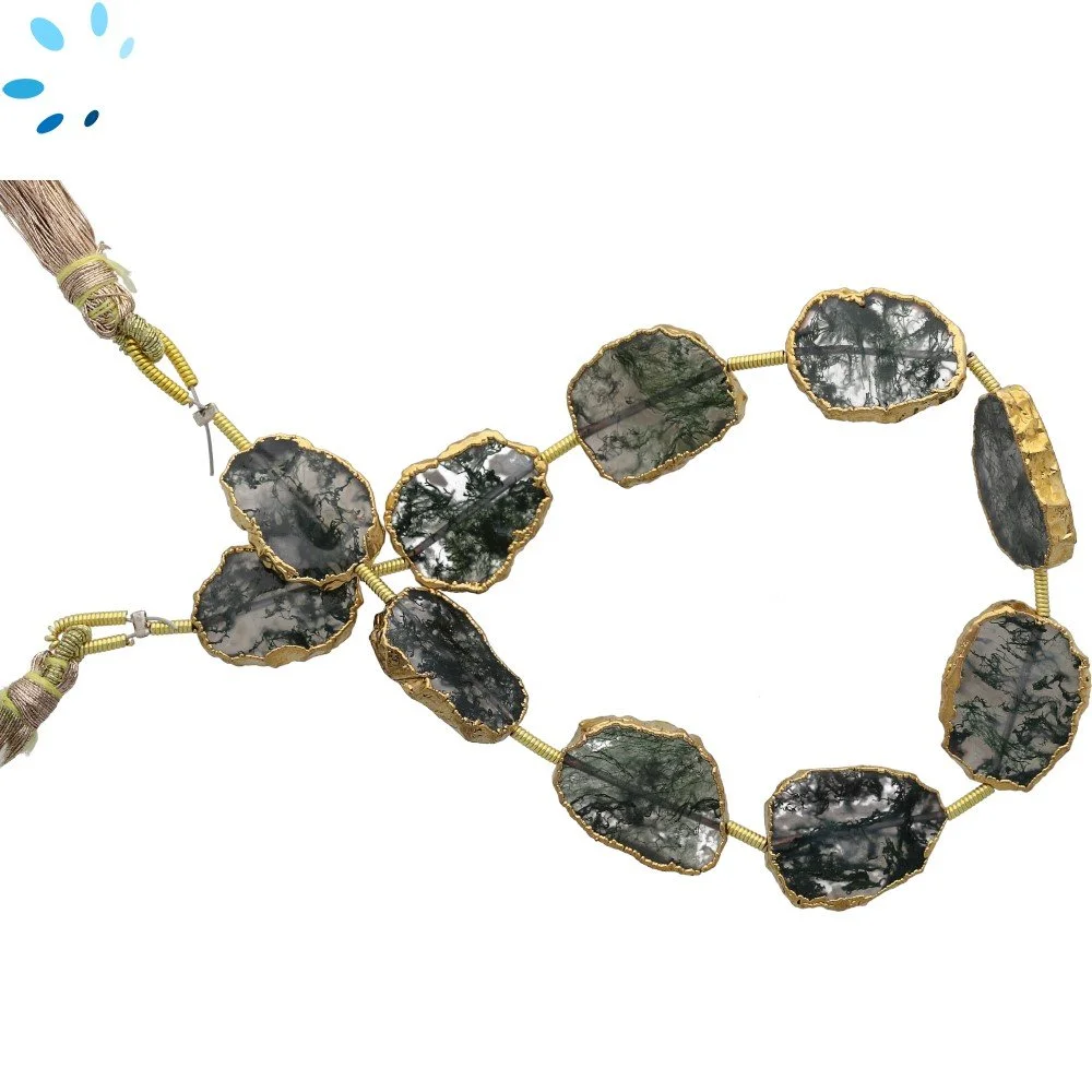 Moss Agate Top to Bottom Drilled Slice Beads 14x10 - 16x12mm - 18k Gold Electroplated