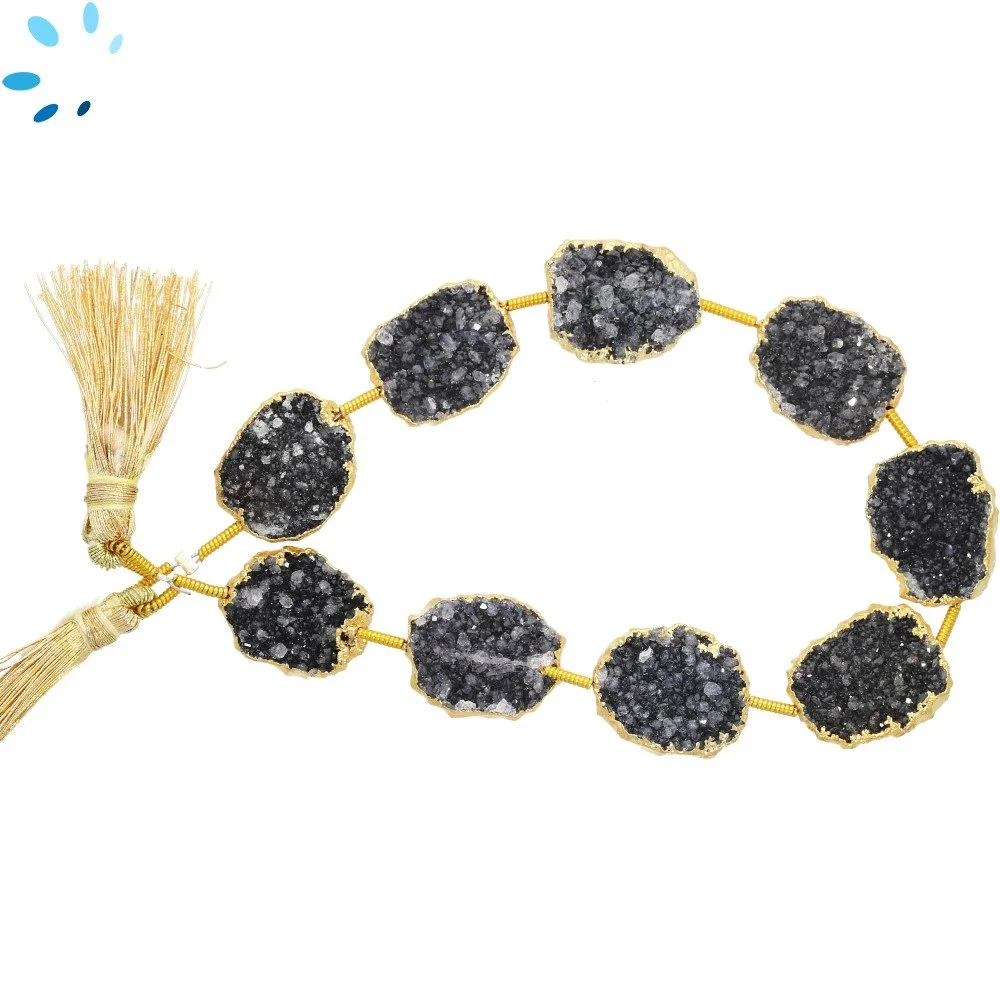 Black Druzy Top to Bottom Drilled Slice Beads 15x11 - 17x13mm - 18k Gold Electroplated