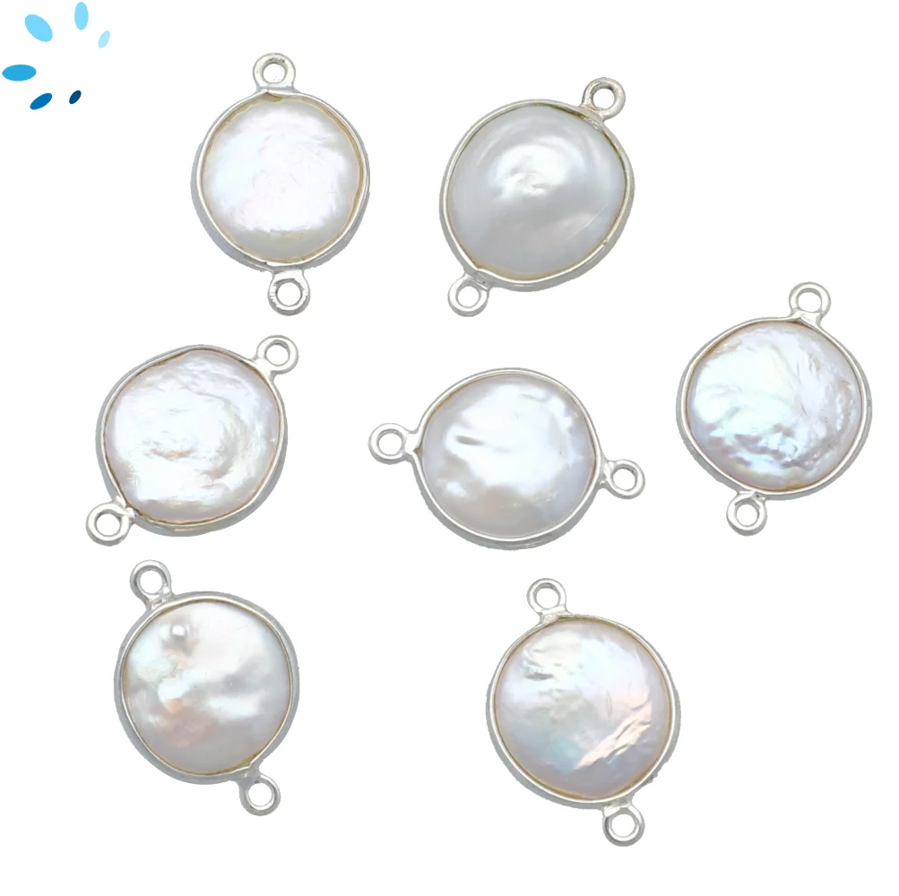Gray Moonstone Coin Bezel Connector 9mm - Platinum Plated Sterling Silver - Set of 4