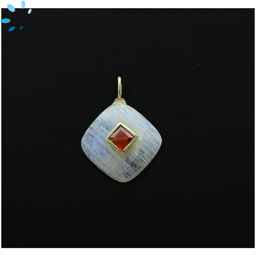 Rainbow Moonstone & Garnet Diamond Inlay Charm Pendant 17mm - 18k Gold Plated Sterling Silver