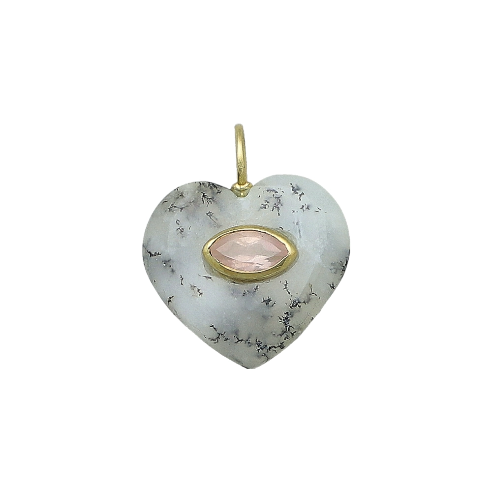 Dendrite Opal & Pink Opal Heart Inlay Charm Pendant 19mm - 18k Gold Plated Sterling Silver