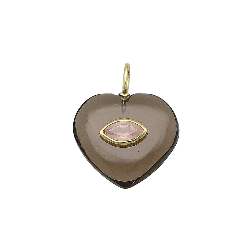 Smoky Quartz & Pink Opal Heart Inlay Pendant Charm 19mm - 18k Gold Plated Sterling Silver
