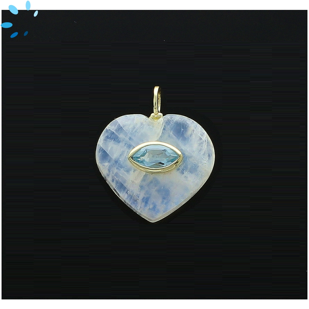 Rainbow Moonstone & Blue Topaz Heart Inlay Pendant Charm 19mm - 18k Gold Plated Sterling Silver