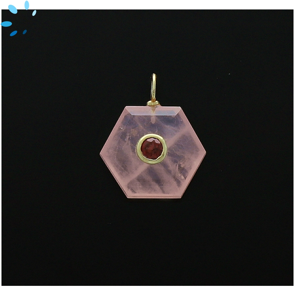Rose Quartz & Garnet Hexagon Inlay Charm Pendant 16mm - 18k Gold Plated Sterling Silver