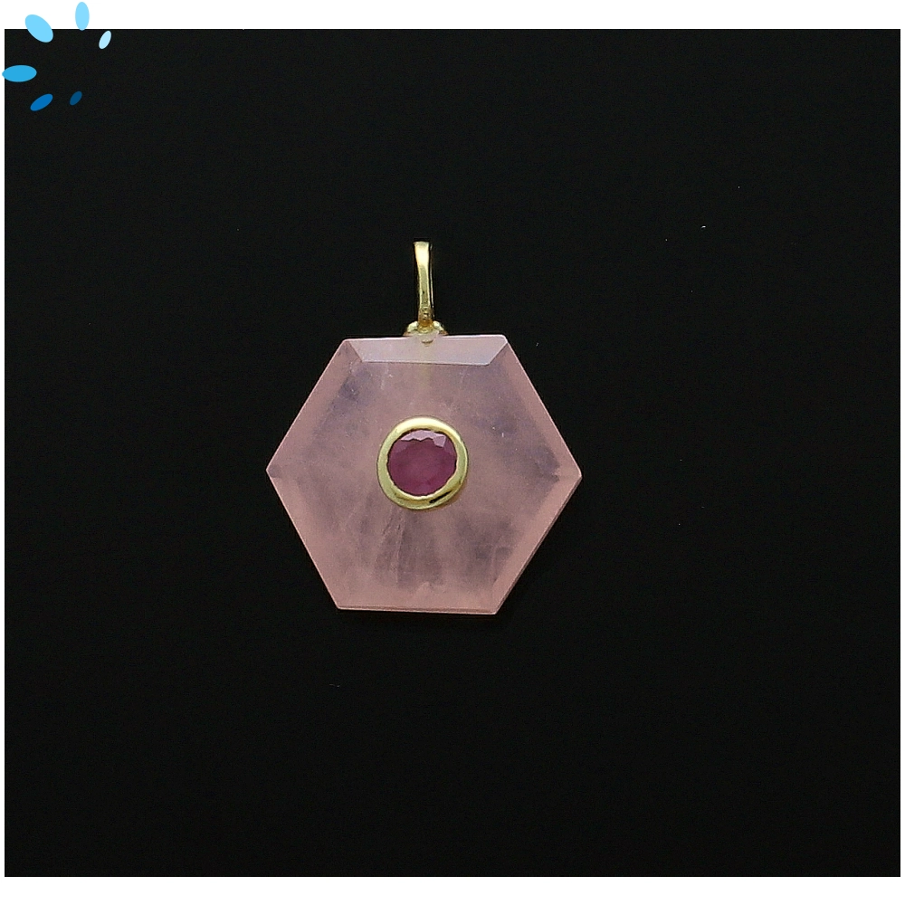 Rose Quartz & Pink Sapphire Hexagon Inlay Pendant Charm 16mm - 18k Gold Plated Sterling Silver
