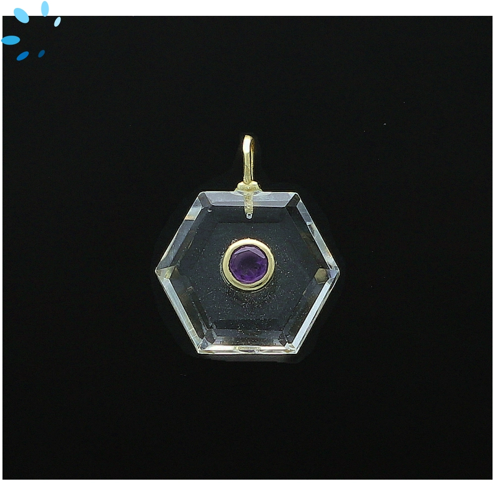 Crystal Quartz & Amethyst Hexagon Inlay Charm Pendant 16mm - 18k Gold Plated Sterling Silver