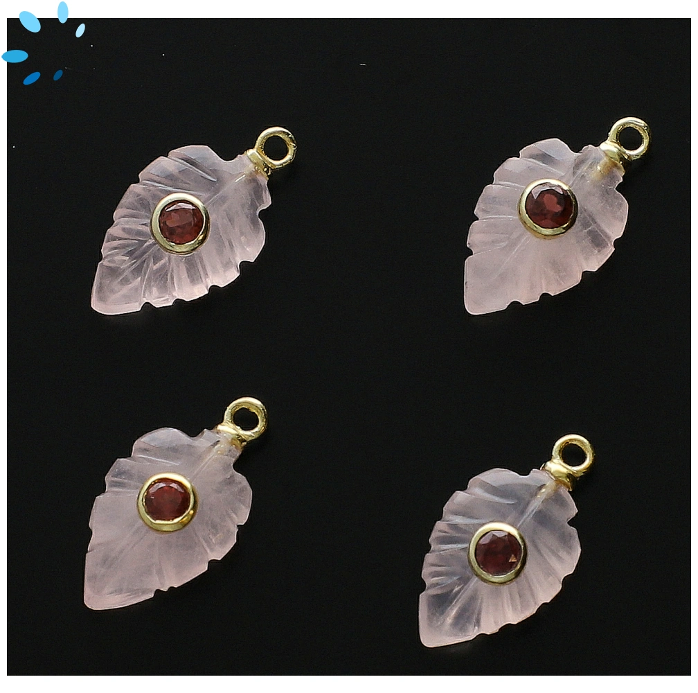 Rose Quartz & Garnet Leaf Inlay Charm Pendant 14x9mm - 18k Gold Plated Sterling Silver