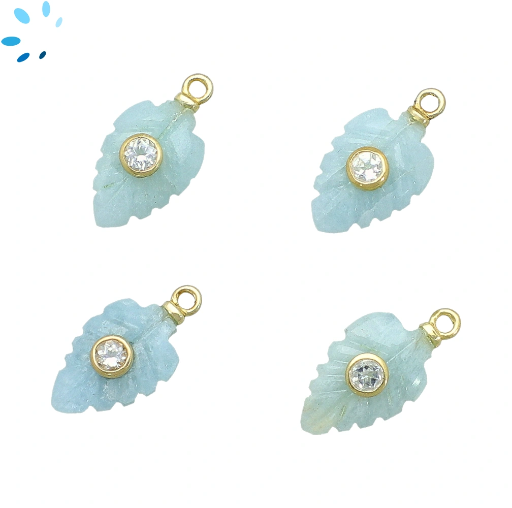 Aquamarine & White Topaz Leaf Inlay Charm Pendant 14x9mm - 18k Gold Plated Sterling Silver