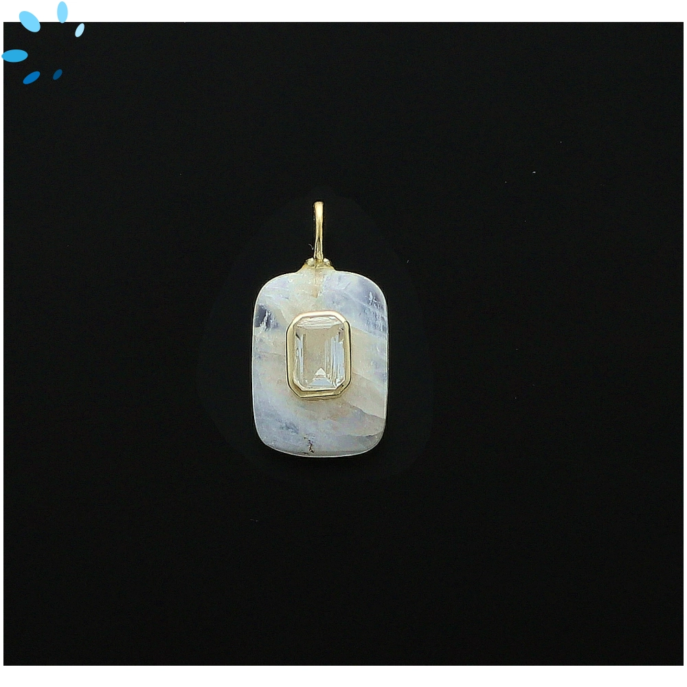 Rainbow Moonstone & White Topaz Rectangle Inlay Charm Pendant 15x11mm - 18k Gold Plated Sterling Silver