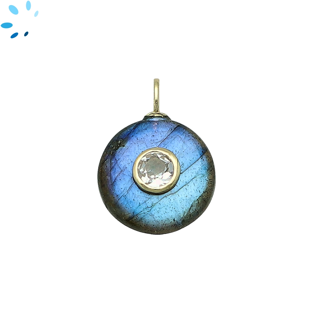Labradorite & White Topaz Round Inlay Pendant Charm 16mm - 18k Gold Plated Sterling Silver