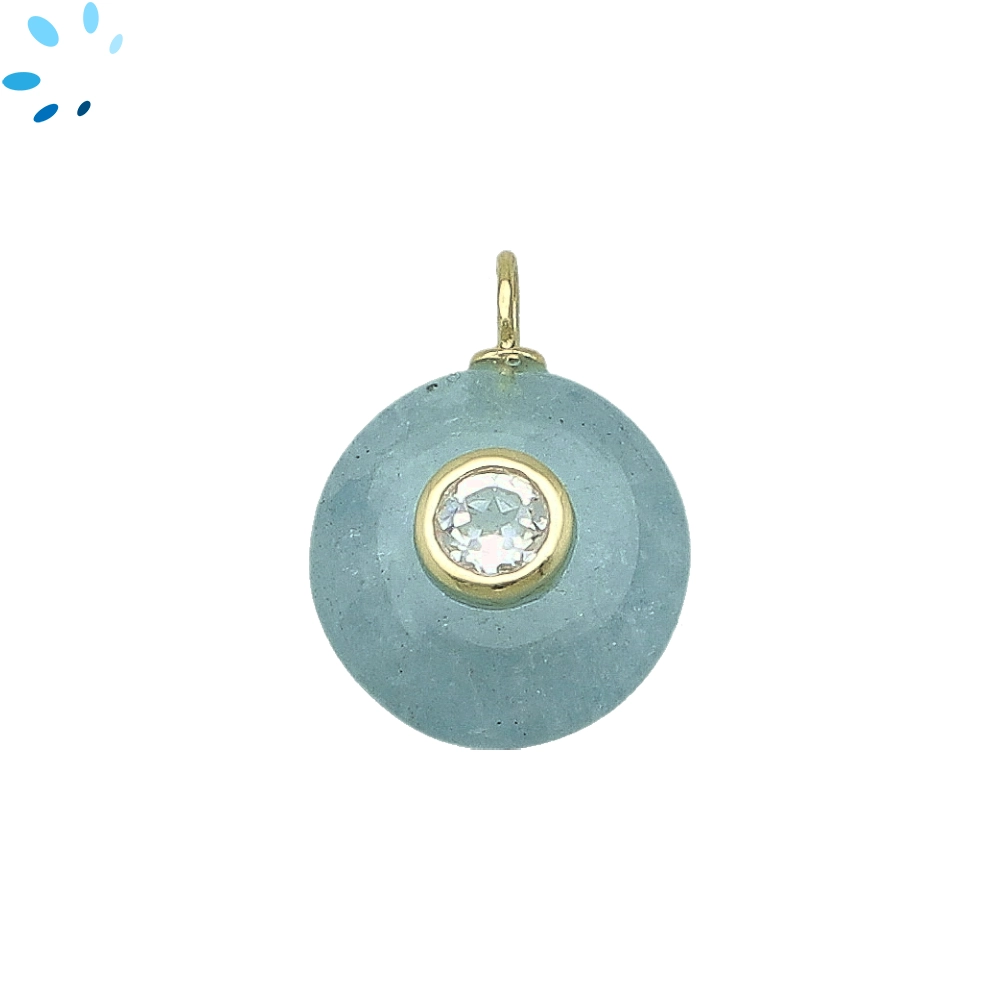 Aquamarine & White Topaz Round Inlay Charm Pendant 16mm - 18k Gold Plated Sterling Silver