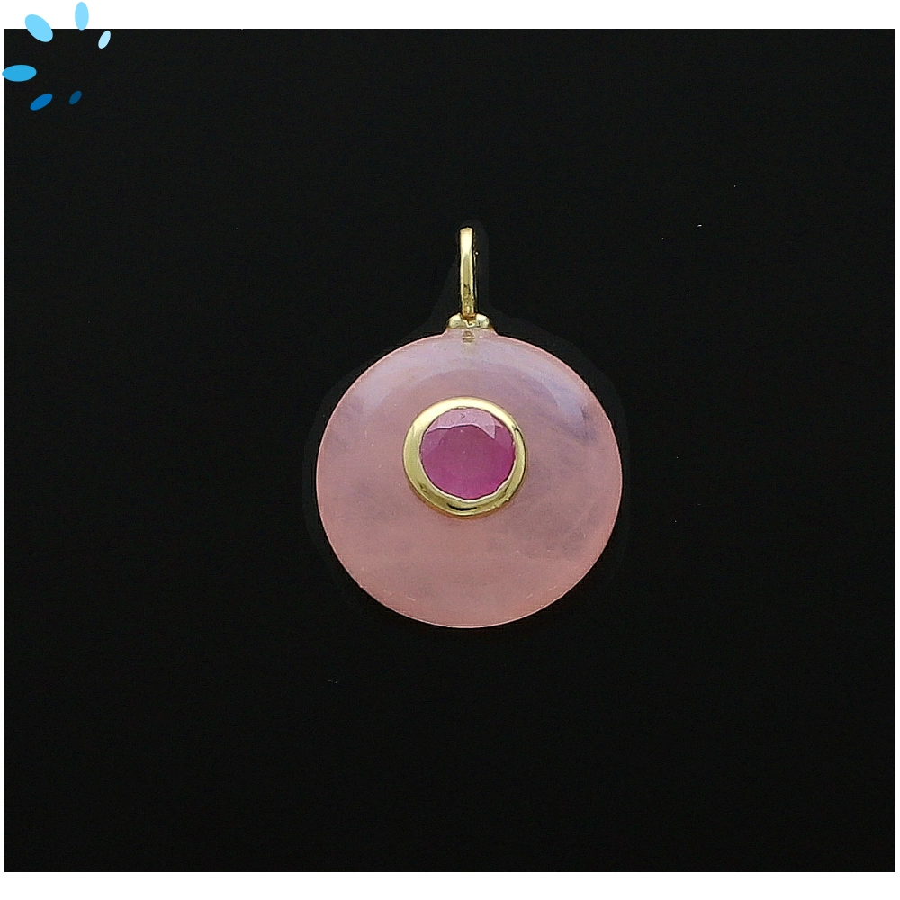 Rose Quartz & Pink Sapphire Round Inlay Charm Pendant 16mm - 18k Gold Plated Sterling Silver
