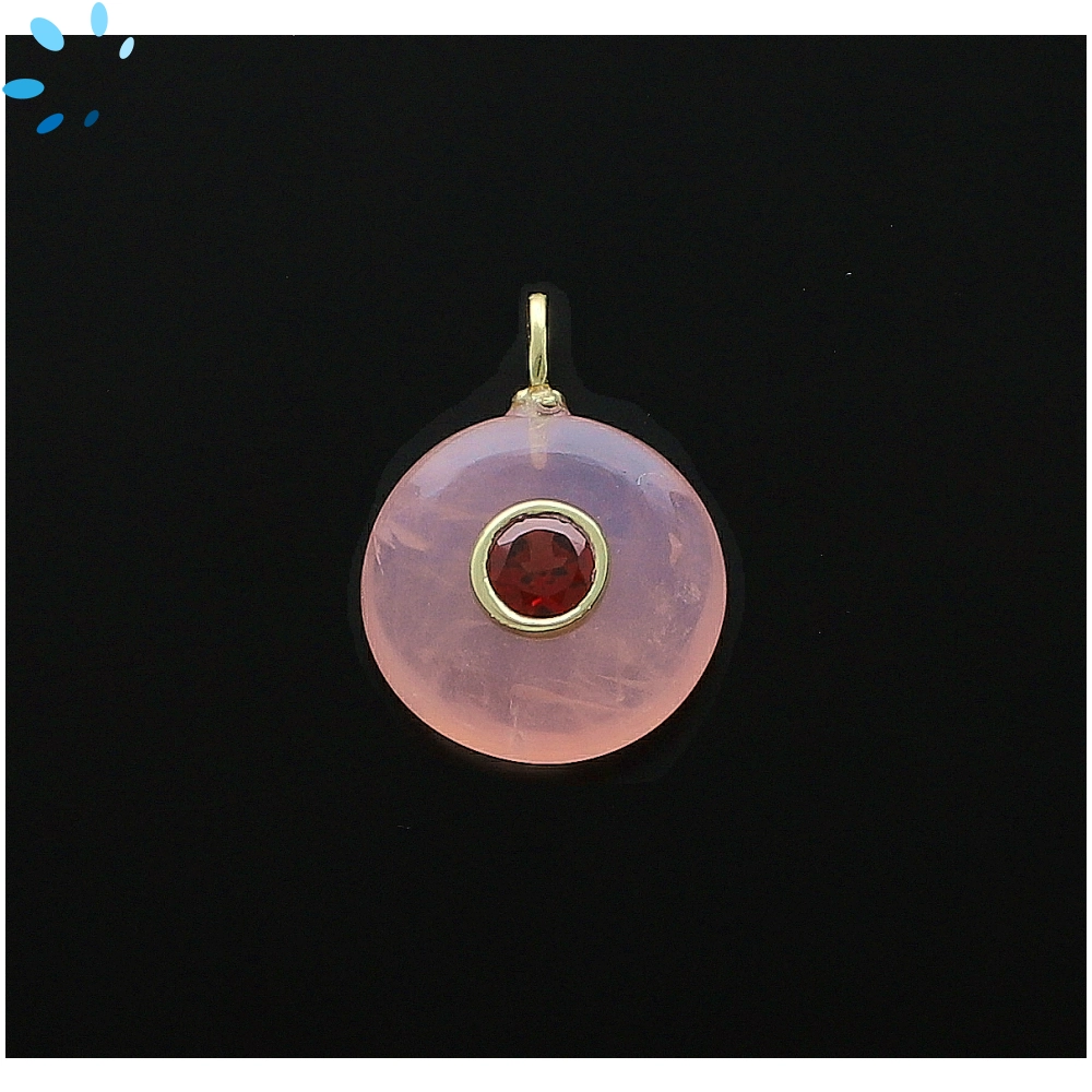 Rose Quartz & Garnet Round Inlay Pendant Charm 16mm - 18k Gold Plated Sterling Silver