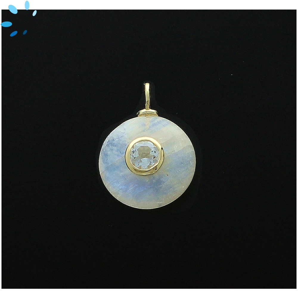 Rainbow Moonstone & White Topaz Round Inlay Charm Pendant 16mm - 18k Gold Plated Sterling Silver