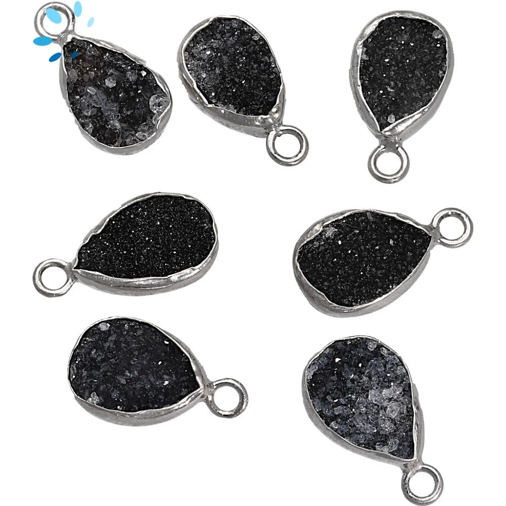 Black Druzy Pear Bezel Charm Pendant 10x7 - 12x8mm - Platinum Plated Sterling Silver - Set of 4