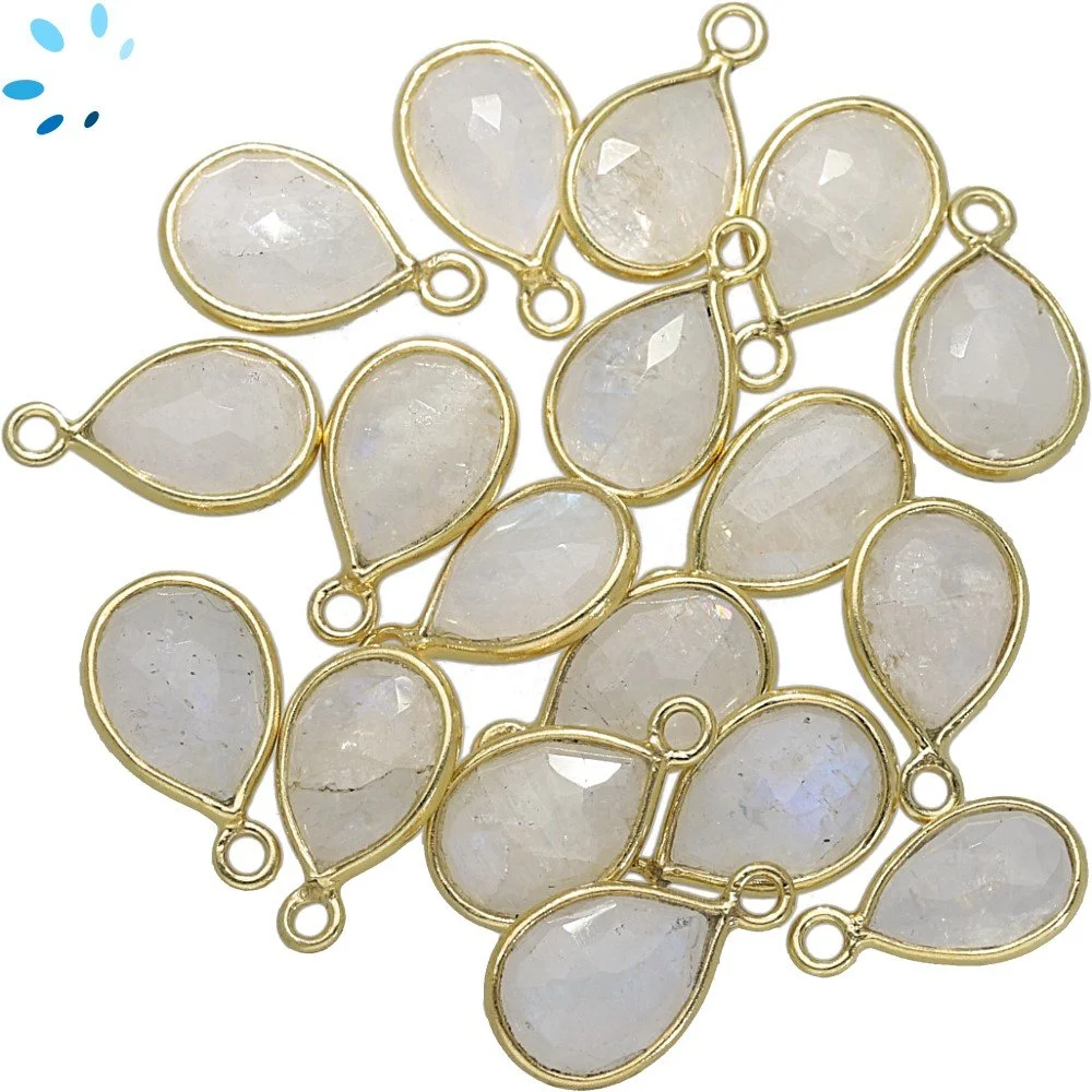 Rainbow Moonstone Pear Bezel Pendant Charm 9x7mm - 18k Gold Plated Sterling Silver - Set of 4