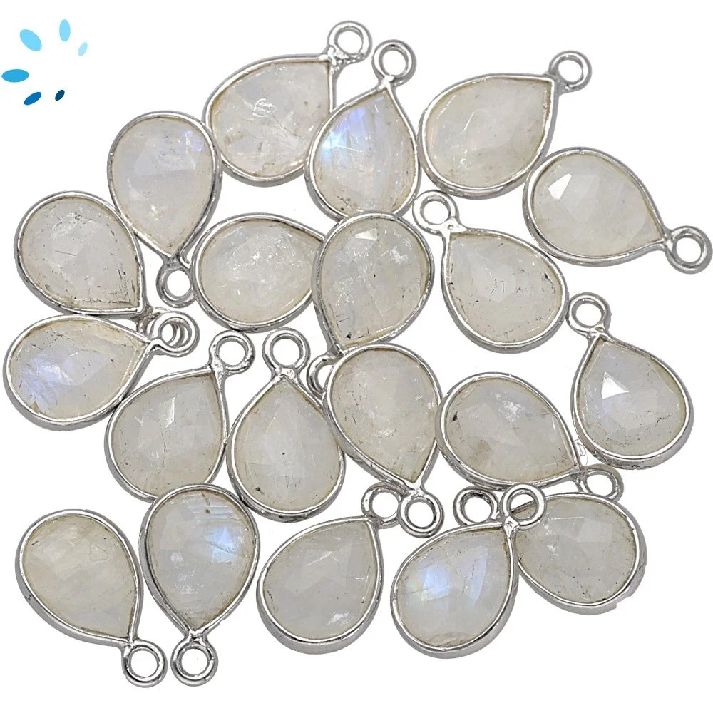 Rainbow Moonstone Pear Bezel Charm Pendant 9x7mm - Platinum Plated Sterling Silver - Set of 4