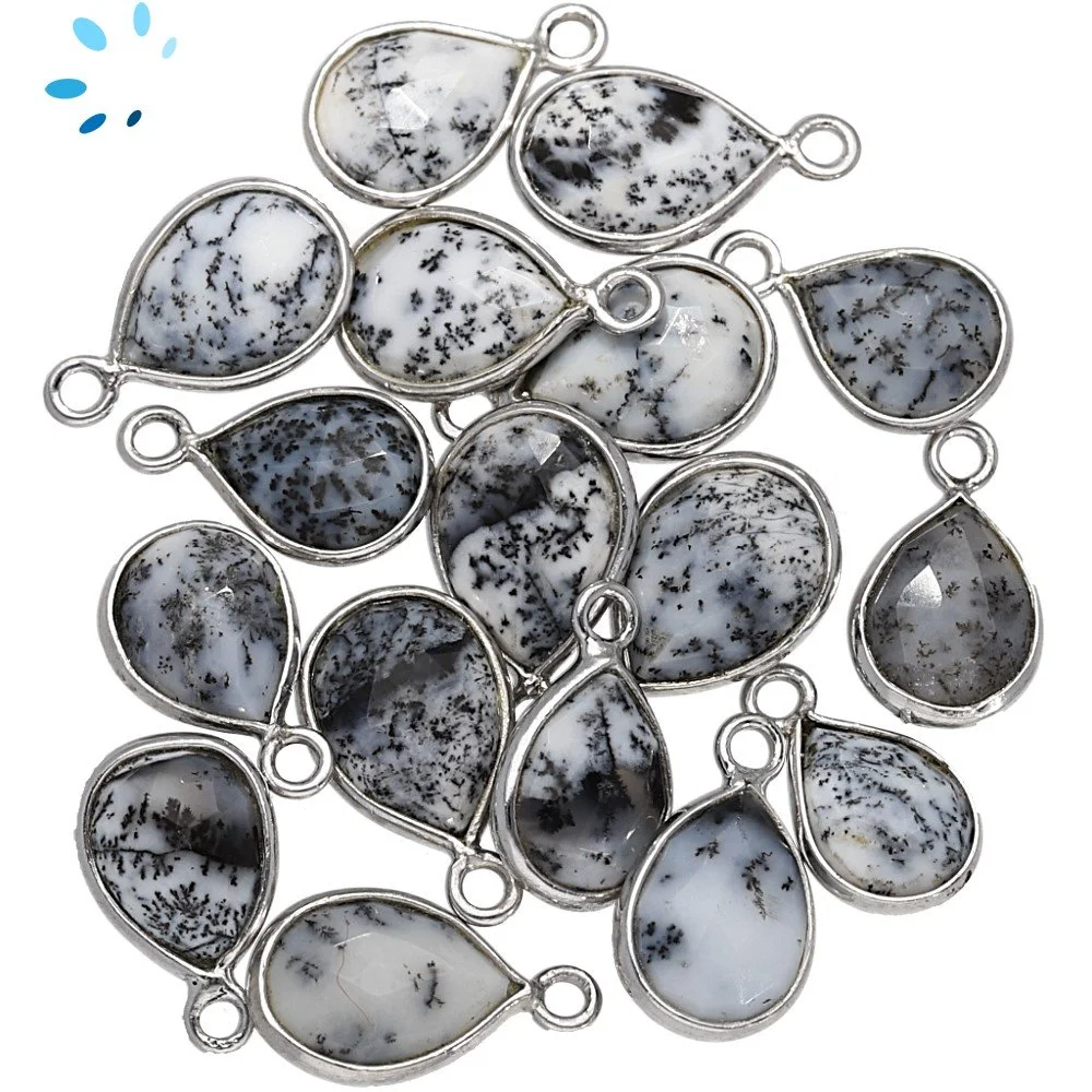 Dendrite Opal Pear Bezel Pendant Charm 9x7mm - Platinum Plated Sterling Silver - Set of 4