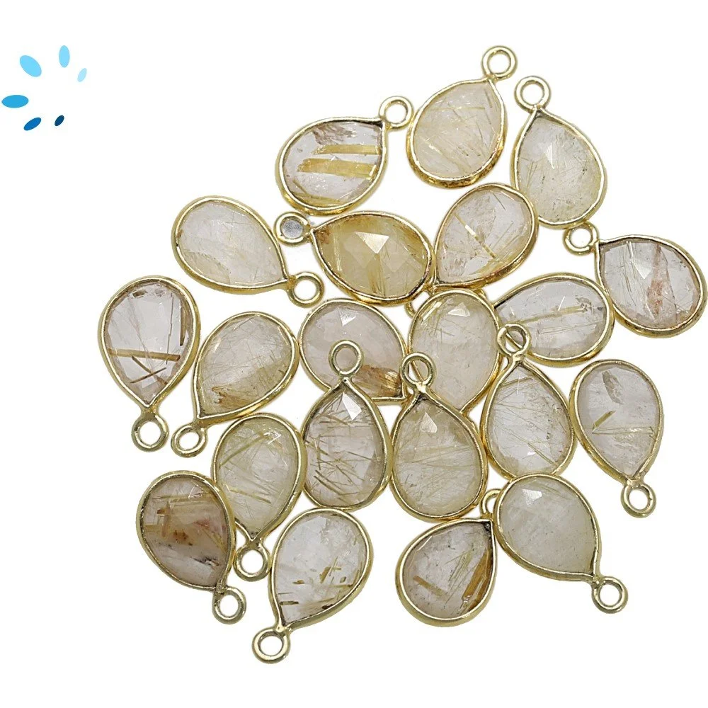 Rutilated Quartz Pear Bezel Pendant Charm 9x7mm - 18k Gold Plated Sterling Silver - Set of 4