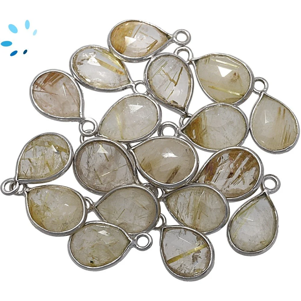 Rutilated Quartz Pear Bezel Charm Pendant 9x7mm - Silver Plated Sterling Silver - Set of 4